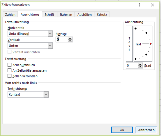 Deutsch: Auswahlfeld zum Einstellen der Ausrichtung von Text in einer Zelle